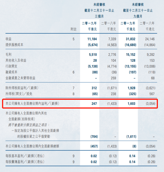 在长年亏损的情况下,公司在2019年12月31日止3个月业绩一反常态大幅增长。营收录得1118.4万港元,净利24.7万,去年同期亏损143.3万港元。