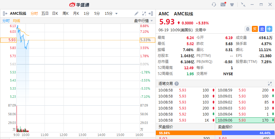 华盛资讯6月19日消息,美股盘初,美国最大院线AMC院线(AMC)高开后涨幅回落,截至北京时间22:09,该股涨5.33%,报5.93美元。