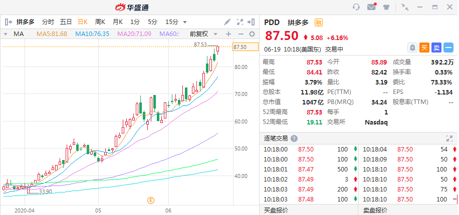 华盛资讯6月19日消息,拼多多盘中快速拉升,截至北京时间22:18,大涨超6%,再次刷新历史高位。