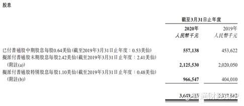 由于盈利能提提升,中国旺旺拟派付截至2020年3月31日止年度的末期股息每股普通股2.42美仙及特别股息每股普通股1.10美仙。公司2019财年累计派息金额达到36.49亿元,同比增长26.74%。