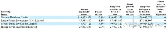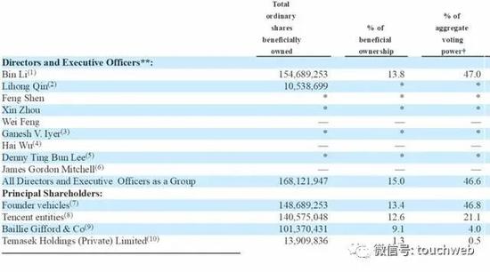 腾讯持股为12.6%,为第二大股东;拥有21.1%的投票权;Baillie Gifford & Co持股为9.1%,有4%的投票权;Temasek Holdings (Private) Limited(淡马锡)持股为1.3%,拥有0.5%的投票权;