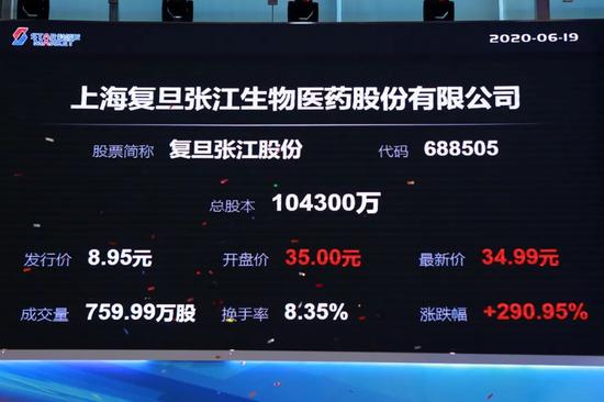 复旦张江昨日开盘价为35元,较发行价上涨291%;收盘价为37元,较发行价上涨313.41%;以收盘价计算,复旦张江市值为385亿。