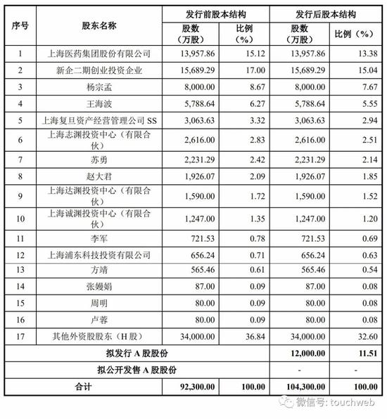 IPO后,上海医药持有内资股及H 股合计占总股本的20.15%;新企二期创业投资企业持股为15.04%;杨宗孟持股为7.67%;王海波持股为5.55%。