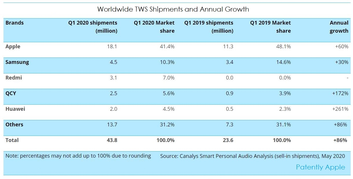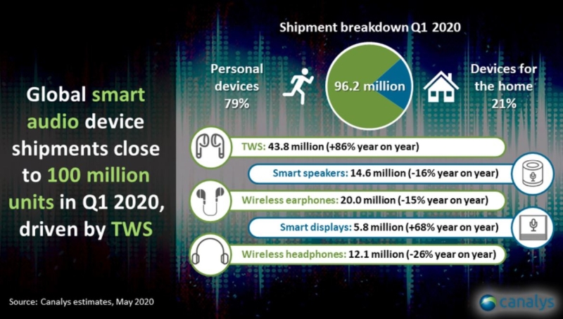 来自分析机构Canalyst的一份最新报告显示,在今年一季度,全球智能音频设备(耳机/音响)的总出货量为9620万件,个人音频设备占比79%,家庭音频设备占比21%,前者同比增加19.4%。个人音频设备出货数量的增加主要得益于苹果公司的AirPods无线耳机,它的出货超过了四大友商(三星、Redmi、QCY和华为)之和。