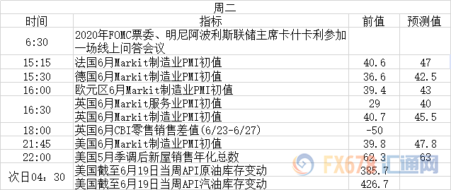 同时周二PMI数据密集,除了欧元区和美国公布制造业PMI数据外,英国还将公布服务业PMI。总体而言,随着全球陆续解除封锁措施,制造业和服务业都出现回暖的迹象,如果周二数据全面好转,可能会提振市场的乐观情绪,因市场会继续押注全球经济最糟糕的时刻已经过去,这可能会提振股市并打压避险资产。