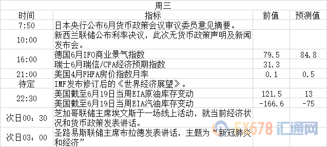 周三首先关注日本央行6月决议审议委员会意见摘要。在刚刚公布的6月决议上,日本央行通过市场操作和信贷安排注资的规模可能从目前的75万亿日元增至110万亿日元,并预计短期和长期利率将维持在当前水平或更低水平,并下调当前通胀预期,且认为CPI同比变化可能暂时为负,同时表示将无上限地提供充足的日元、外汇资金。日本央行可能会公布做出上述决定有关细节。