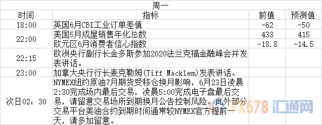 周一(6月22日)关键词:美国成屋销售、加拿大央行行长讲话、nymex纽约原油7月合约移仓换月