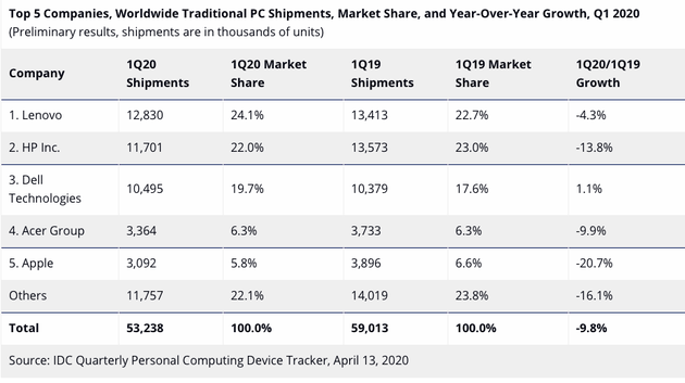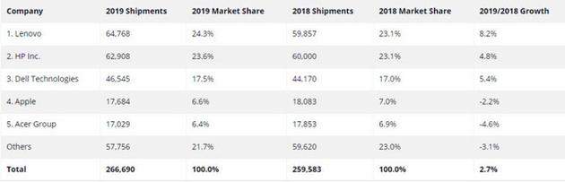但好景不长,很快到来的新冠疫情又给消费电子行业带来了明显打击。今年第一季度全球PC出货量锐减9.8%,苹果又是其中降幅最大的厂商,第一季度出货暴跌20.7%,市场份额不仅跌破了6%,还落到了全球第五位。实际上,自从2015年出货量突破2000万部之后,苹果电脑过去几年的出货量一直在下滑。