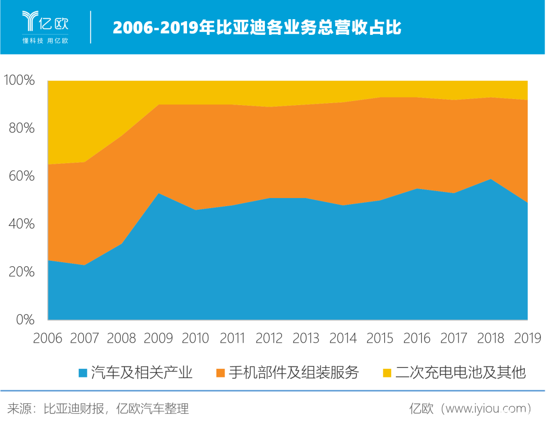 2003年,比亚迪收购秦川汽车开始进入汽车行业。自此之后,汽车便成为比亚迪最主要的三大业务之一。2009年之后,汽车便一直是比亚迪第一大业务。