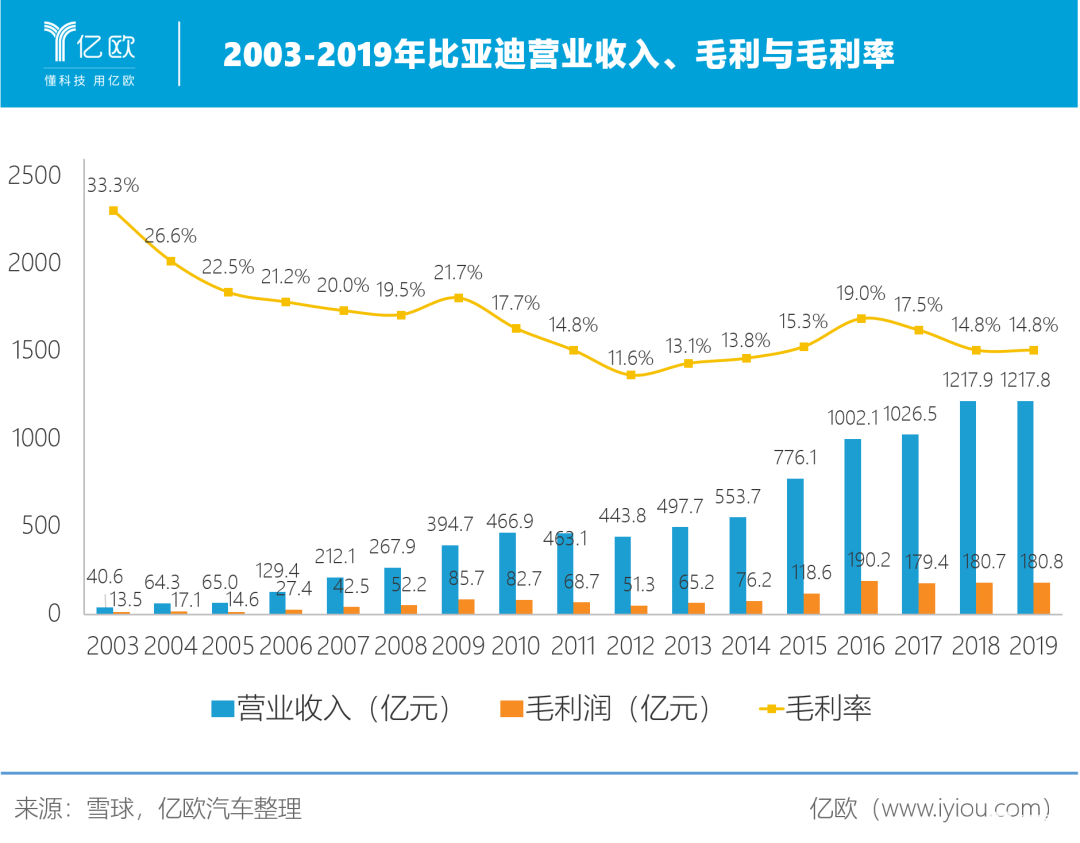 作为一个主打中低端车型的车企,性价比很大程度上决定着比亚迪车型的竞争力。但市场的日益成熟导致汽车毛利率逐年降低,这一天下大势在比亚迪身上得到了直观的反映。