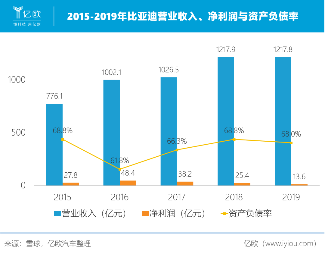但加大研发并未给比亚迪换来足够的回报。自2016年起,比亚迪的净利润不仅逐年下滑,且每年的下滑幅度均超过10亿元,资产负债率也从61.8%攀升至68%。