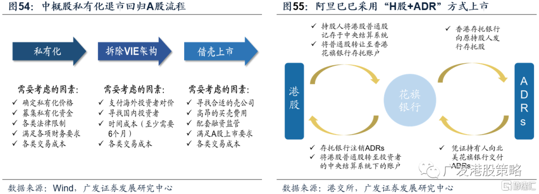 在回归中国资本市场的路径选择上,目前中概股回归存在三种选择:(1)美股私有化退市,重新A/H上市;(2)保留美股上市地位,在A/H市场双重上市;(3)保留美股上市地位,在A/H市场第二上市。