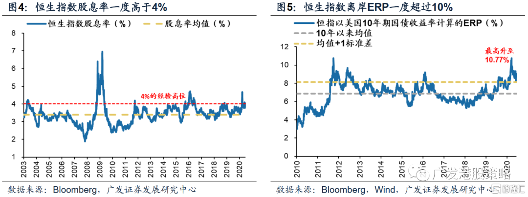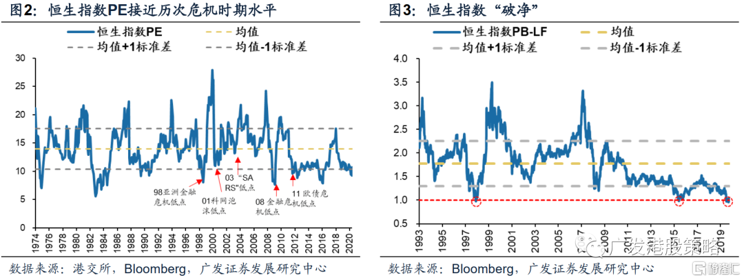 那么对于长线SAA的资金而言,怎么去衡量港股估值到底是不是极端低估值?我们提供两个经验指标以供参考: