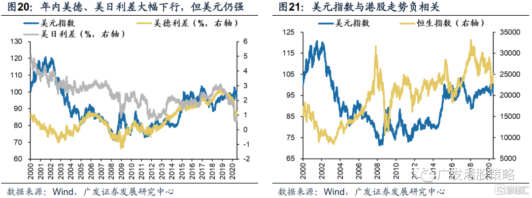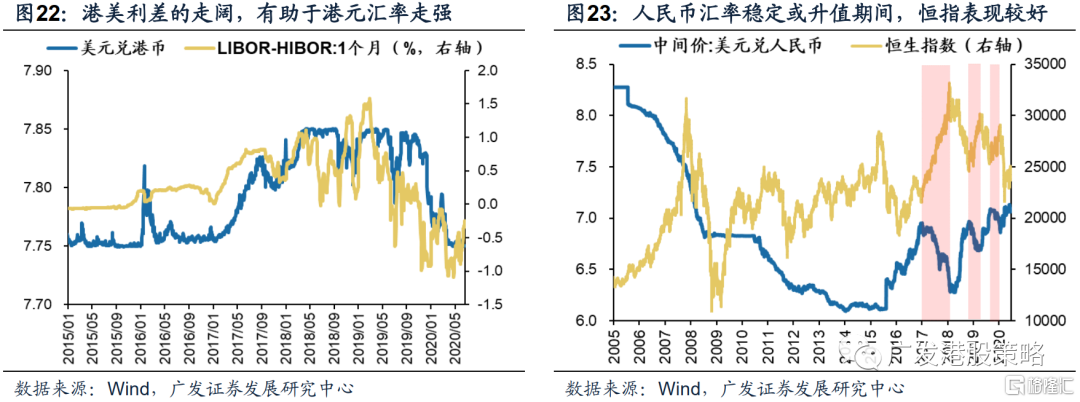 第二,联储“无底限宽松”背景下,Libor-Hibor利差走低对港元较强有一定解释力,预计下半年该趋势将维持。复盘历史上强港元期间恒指表现,虽然强势港元不必然带来股价上涨,但相较于港元走弱,“港币保卫战”背景下,港股承压的情形(如18-19年),强港元对于港股仍是较为有利的条件。