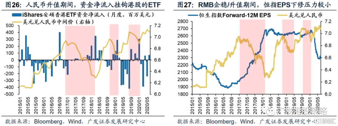 总体来看,人民币趋稳甚至反弹利好港股,市场有望出现外资回流、盈利上修的“正反馈”:(1)稳定的人民币对外资意味着稳定的风险溢价“锚”。历史上人民币贬值期间(2015.08—2017.01、2018.04—2018.11、2019.05—2019.09),海外挂钩港股的ETF多数时间表现为净卖出;而人民币升值期间,资金面环境更为友好,外资流出压力不大,且多数时候变现为净流入。(2)人民币汇率企稳反弹更重要的利好在于稳定市场对港股的盈利预期,近期市场对于港股EPS一致预期已经开始出现上调。