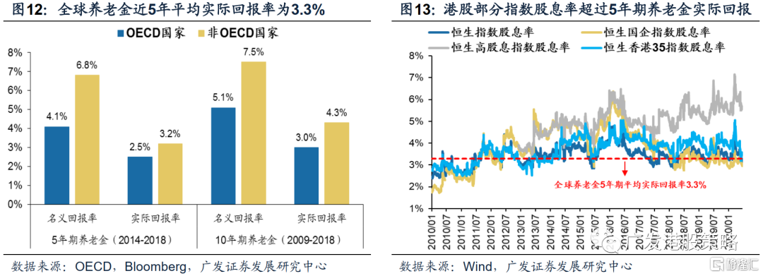 第一,站在海外养老金(OECD和非OECD国家)的维度,长期实际回报率是逆向布局的价值“锚”,目前恒指股息率高达3.95%,介于5年期(3.3%)和10年期(4.1%)平均实际回报率之间,高股息的港股对于海外养老金而言已具备长期配置价值。