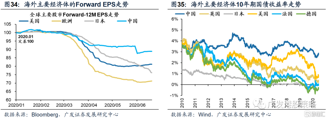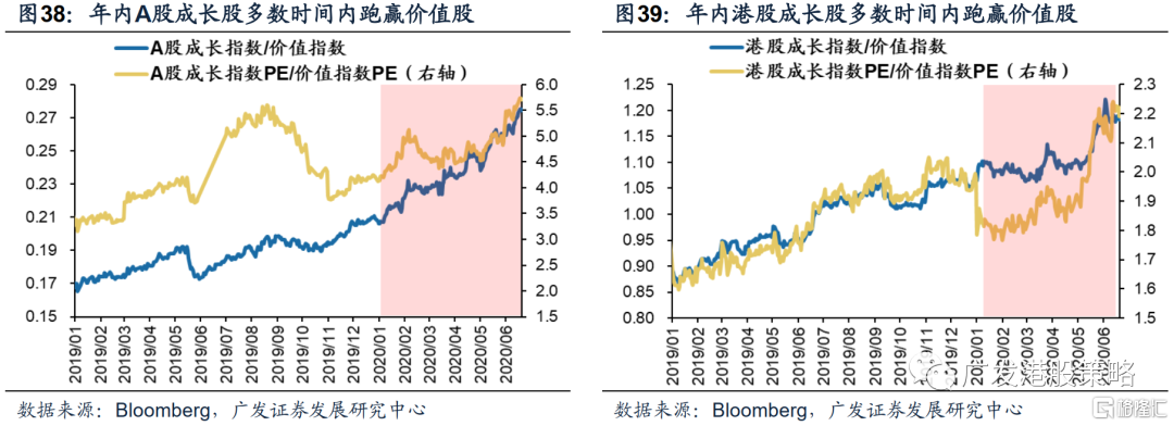 从上半年风格走势来看,我们考察的全球部分市场(美股、欧洲、AH)成长股在大多数时间内跑赢价值股;但值得注意的是,随着成长对价值的相对估值大幅走高,加上全球复工后企业盈利增长预期的修复、长端债券利率的触底反弹,成长股的“双重溢价”有所收敛,近期欧美市场的价值风格已经开始跑赢成长。对于AH市场而言,我们同样需要警惕“基本面预期和相对估值的背离”,成长“一枝独秀”的概率正在下降。