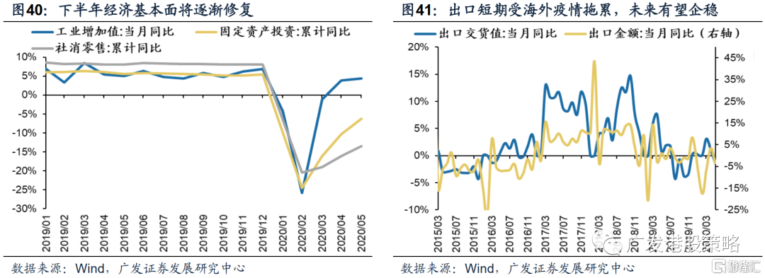 从经济总量的趋势来看,下半年的主基调是“修复”,意味着宏观和盈利Beta的回归。自Q1砸出“疫情坑”之后,国内经济开始进入修复期,3-5月份工业增加值、固定资产投资、消费数据全面改善,出口增速受到海外疫情拖累表现疲弱,但后续欧美复工有助于出口企稳。