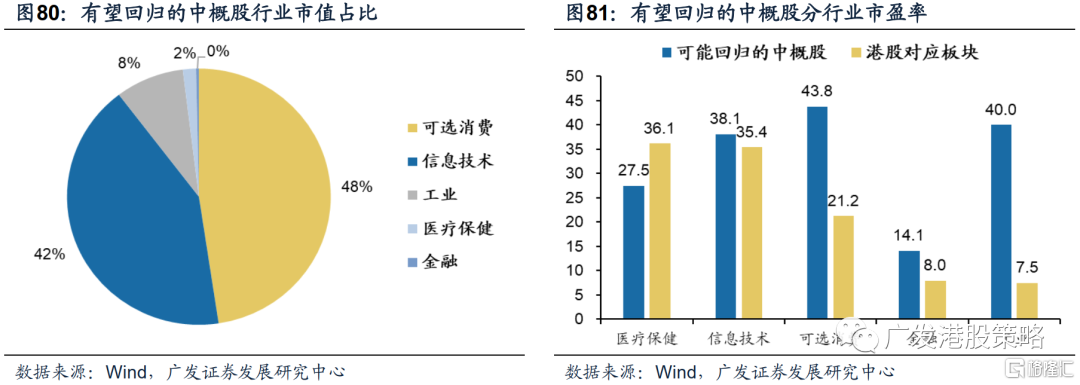 阿里成功回归为其他海外中概股提供了“范本”,增强了中概股回归的信心。从行业维度来看,潜在中概股回归标的主要分布在科技和消费等“新经济”领域,信息技术、可选消费、医疗保健分别占50%、27%、7%;从估值维度来看,潜在中概股回归公司中,信息技术和可选消费的估值要高于港股相应板块的估值,回归后可以继续拉动港股相关板块的估值,但医疗保健的估值优势不明显。