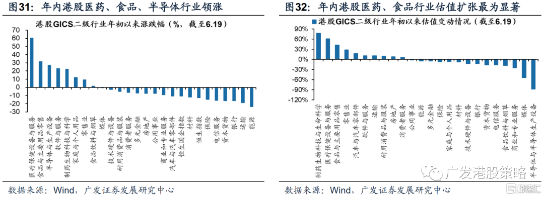 上半年的港股“叫人欢喜叫人忧”,体现为“结构牛、指数熊”。新冠疫情、海外波动、中美冲突等利空导致港股指数大跌,恒指一度突破2016下半年以来的低位,最低跌至21139.26点;但从结构表现来看,消费、医药、互联网等疫情“不敏感”板块却实现了盈利和估值的“双升”,体现出较强的赚钱效应。