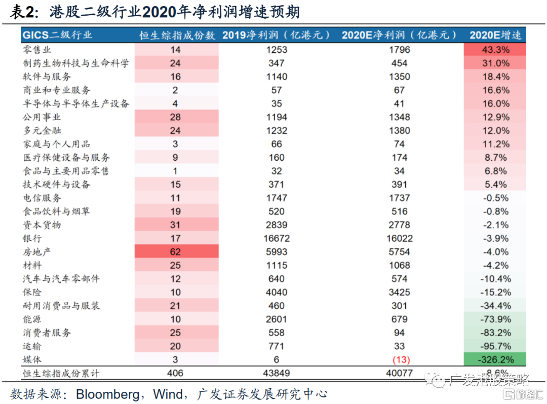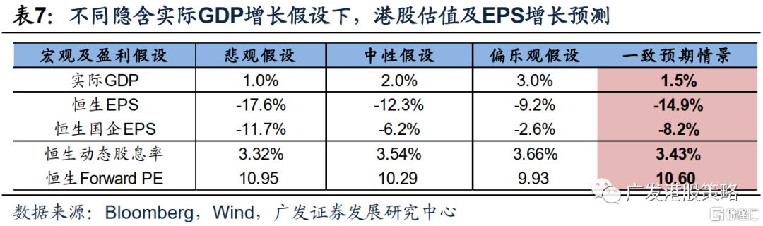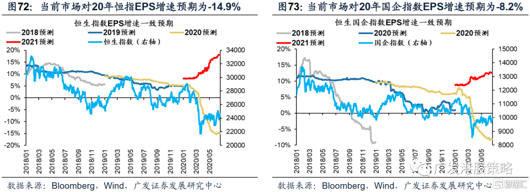 我们结合不同隐含实际GDP增长假设下,对港股估值及EPS增长进行敏感性测算。悲观、中性、乐观三种情景下,恒指2020年EPS预期增长约为-17.6%、-12.3%、-9.2%,国企指数2020年EPS预期增长约为-11.7%、-6.2%、-2.6%。当前恒生及恒生国企指数2020年一致预期EPS隐含的实际GDP增长约为1.5%,名义增长约2.7%,其预测介于中性及悲观情景之间;