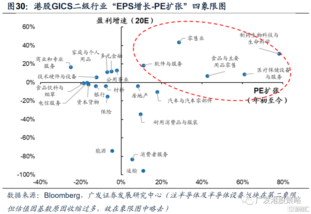 为了研究疫情之下港股板块的结构分化特征,我们构建了港股GICS二级行业的“EPS增长-PE扩张”四象限图: