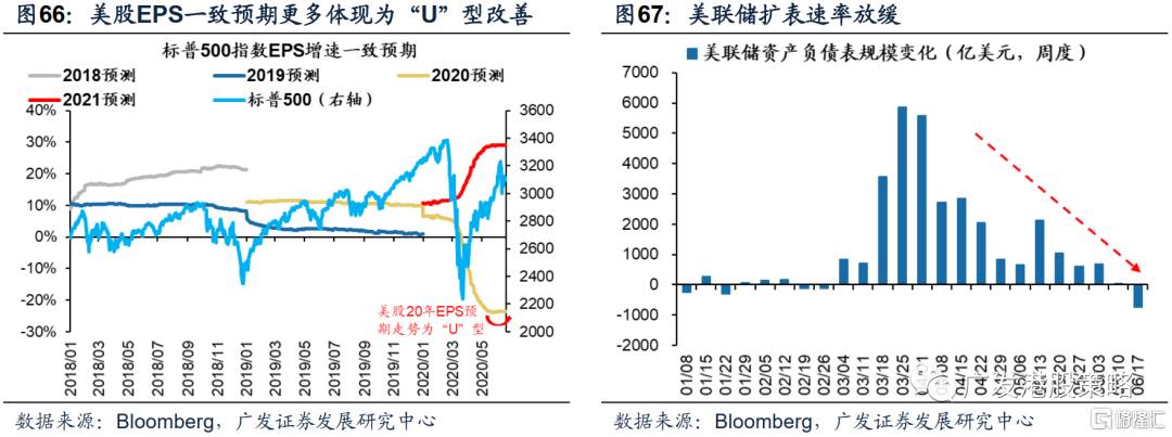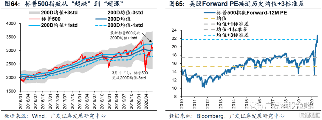 我们以美股为例,6月份以来市场毫无疑问已进入“超买”状态,对应标普500的动态估值也超过历史均值+3倍标准差的超高水平,但这种“超买”背后映射的是“宽松依赖症”幻觉,货币政策边际变化、基本面“V”型反转预期的修正、财政刺激的阶段性退出都可能带来市场的波动。我们预计,在3季度不排除出现因基本面和流动性乐观预期修正带来的估值回撤。
