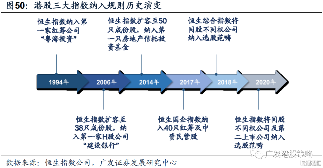 过去受指数纳入规则限制,同股不同权架构或第二上市公司纳入港股主流指数面临一定阻碍。为更充分反映市场转型,近年来恒生指数公司不断优化选股范畴。2018年恒生综指放宽选股范围,纳入同股不同权公司;今年5月,恒生指数公司进行又一次重大调整,宣布同股不同权及第二上市公司正式被纳入恒生指数、国企指数选股范畴。