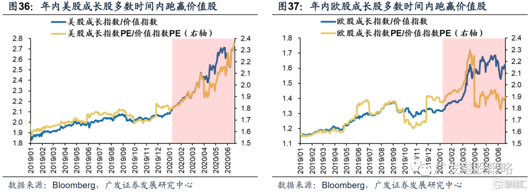 新冠疫情冲击之下,全球权益市场大多数公司分子端的盈利增长面临大幅下滑,“免疫性”强的成长公司享受了第一重“确定性溢价”;而在联储无底线量化宽松背景下,贴现率预期处于下行通道,再次为盈利“能见度”的成长品种提供了第二重“流动性溢价”。而当市场波动加剧时,投资者“抱团取暖”的交易行为反过来又加大了成长对价值风格的相对估值偏离。