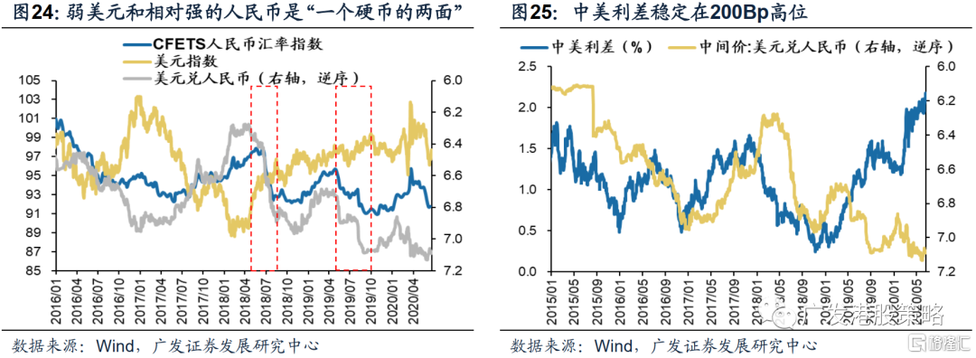 第三,人民币汇率贬值的空间有限,下半年不排除升值。中美利差、经济增速差是影响人民币汇率的基本面因素,5月以来中美利差维持200Bp高位波动,对人民币汇率企稳存在一定支撑;而经济增速差来看,中国进入“缓疫期”之后对美国经济的相对优势有所扩大,同样不支持人民币兑美元显著贬值。潜在的利空因素来自于中美关系反复,但取消中美第一阶段贸易协定、对香港金融制裁等极端的情形没有出现,汇市对预期之内的中美风险事件也开始“脱敏”。