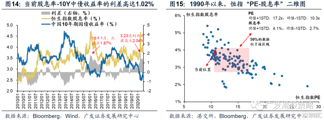 第二,站在南下资金的维度,当股息率-长端利率的利差走阔,或“PE-股息率”二维图偏离度较高时,南下资金倾向于增加港股配置。当前股息率-10Y中债收益率的利差高达1.02%,股息率和PE的“价值钟摆”也偏离合理均值,均属于历史上的估值下限区域。
