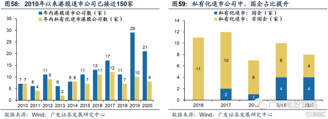 港股市场退市制度较为宽松,2010年以来退市公司已接近150家。除被动摘牌外,较多公司选择主动私有化退市。尽管港股每年私有化退市公司总数维持在10家左右,但对公司属性进行分类可以发现,国有企业私有化退市的公司中占比大幅提高——2019年至今已完成私有化退市的18家公司中,共有8家属于国有企业。