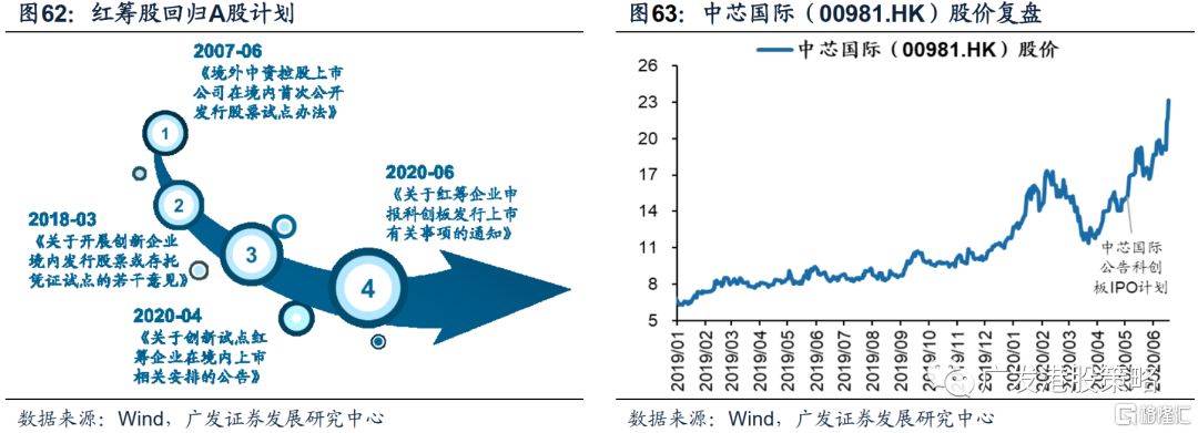 关于红筹股回归A股的政策安排持续多年,但进展缓慢。2007年,证监会发布《境外中资控股上市公司在境内首次公开发行股票试点办法》,但由于草案要求红筹股回归时需拆除红筹架构,导致港股红筹股回归意愿并不强烈;2018年,证监会发布《关于开展创新企业境内发行股票或存托凭证试点的若干意见》,鼓励红筹股A股IPO或发行CDR。鉴于上市标准依然较为复杂,新规并未加速红筹股回归。