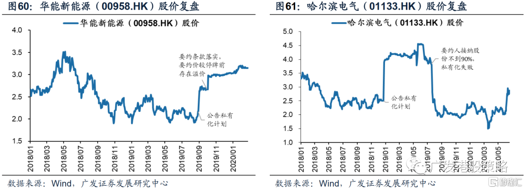 港股国企私有化可能带来哪些投资机会?获得一次性套利收益是投资者最主要的考量。由于私有化要约价格往往显著高于公告前收盘价,因此私有化消息公开后,公司股价通车会出现“跳涨”。但值得注意的是,由于退市规则要求企业在一定时间内取得独立股东90%以上的股份,因此一旦计划未获得通过,股价面临回落风险。典型的案例如哈尔滨电气(01133.HK),公司因未能获得足够的独立股东股权而宣布私有化失败,公司股价大幅下跌。