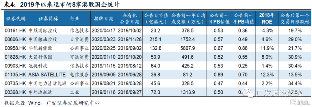 其二,公司质地不差,但估值被严重低估。8家国企中,多数公司退市前基本面良好,而华能新能源(00958.HK)、亚洲卫星(01135.HK)在其退市前一年ROE更超过10%。但8家公司私有化公告前一年的平均PB估值均不到1.0。并不算差的基本面对应着极低的估值,公司价值被市场严重忽视。
