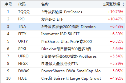 纳斯达克指数上周5个交易日全部收高,一周累涨3.73%,基本上牛冠全球。因此股指类ETF中,上周表现最好的是3倍做多纳指ETF,大涨10.75%。
