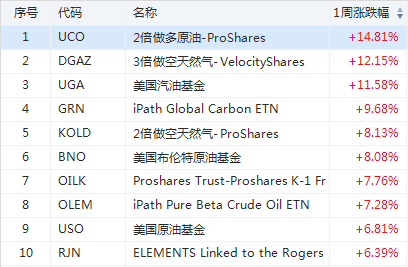 该组织提高原油价格的决心刺激了油价的大幅走高,纽约商业交易所7月交割的西德克萨斯中质原油(WTI)期货上周大涨9.6%,相关ETF也纷纷大涨,2倍杠杆的UCO涨幅近15%。