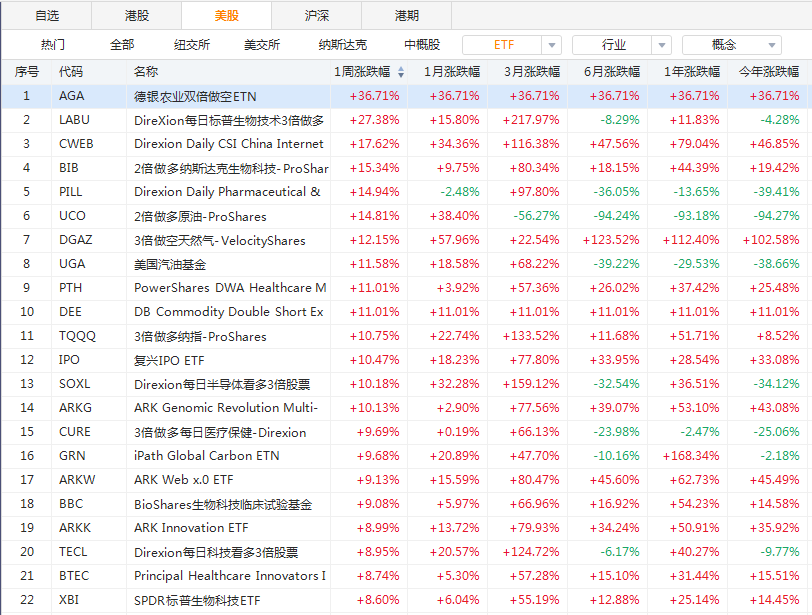 从美股ETF的表现来看,上周表现最佳的美股板块是生物科技板块(忽略AGA,该ETF停牌已久),而主要大盘指数中,又属纳指涨幅最高。原油和天然气则是表现突出的大宗商品,大幅跑赢了其他很多资产。
