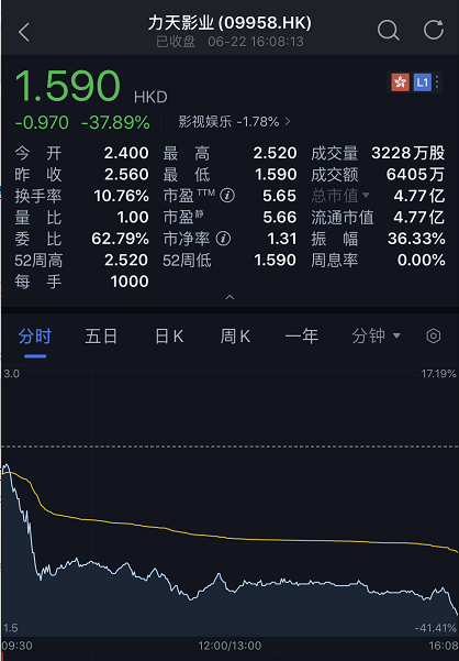 6月22日,力天影业于港交所正式上市,但上市首日便破发,截至下午港股收盘时,股价下跌近40%,收于1.76港元/股,市值蒸发2.43亿港元。