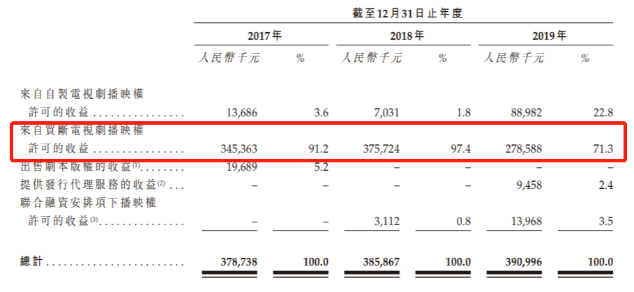 除此之外,力天影业招股书中披露了于往绩记录期间,公司所发行79部买断电视剧发行客户的详细名单。其中:仅《功夫之爱的速递》、《婚姻遇险记》、《婚姻历险记》、《荡寇》四部剧集播映于在线媒体平台,余下75部剧集均单一仰仗电视台渠道。且仅《梦在海这边》、《爱在星空下》两部剧集登上一线卫视平台,其余97%以上剧集均发行给二三线卫视。
