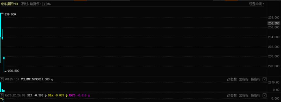 京东首日交易以239.00港元开盘后,也出现下跌,今日收盘价为228.00港元,跌幅-2.40%。