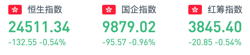 周一,恒生指数开盘跌0.47%,午后曾挫逾200点,尾盘跌幅有所收窄,全天呈窄幅震荡走势。截至收盘,恒生指数跌132.55点或0.54%,报24511.34点,全日成交额达1195.81亿。国企指数跌0.96%,报9879.02点,红筹指数跌0.54%,报3845.4点。