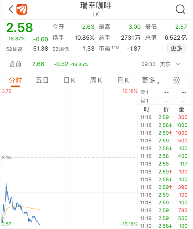 受此消息影响,23日晚间,美股开盘,瑞幸咖啡股价便大跌超16%。截至发稿,瑞幸咖啡股价下跌18.87%,报2.58美元。