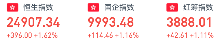 周二,恒生指数开盘涨0.12%,盘初探底后回升逾1%,随后维持震荡上涨走势。截至收盘,恒生指数涨396点或1.62%,报24907.34点,全日成交额达1194.47亿。国企指数涨1.16%,报9993.48点,红筹指数涨1.11%,报3888.01点。