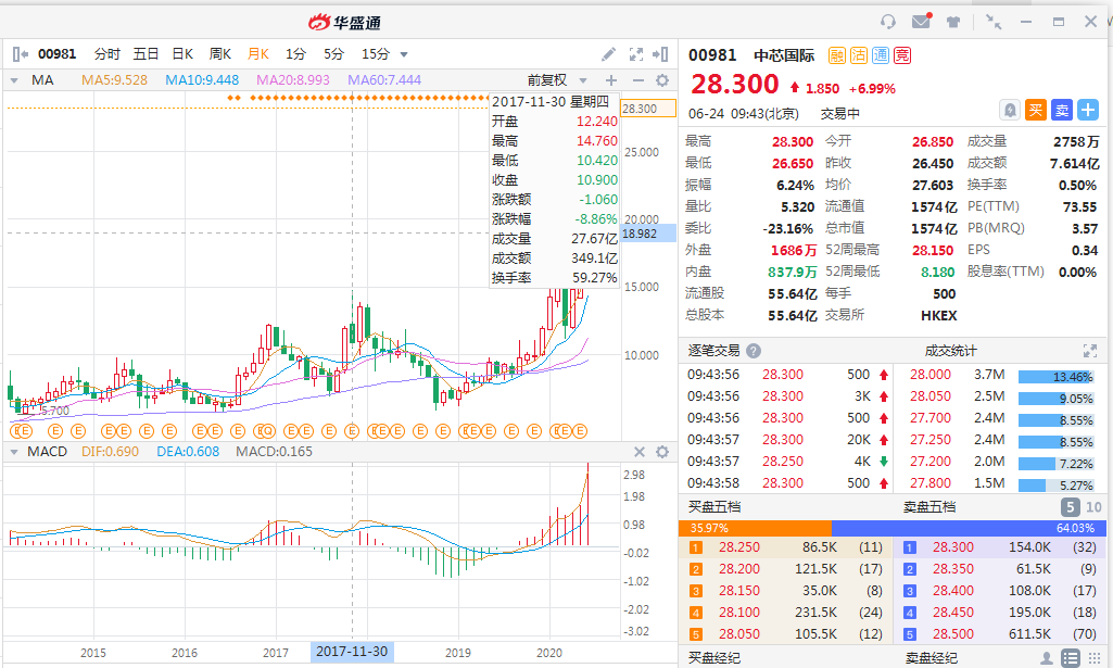 新浪港股讯 6月24日消息,持续受益科创板上市,中芯国际再涨6.99%,报28.3港元创新高。