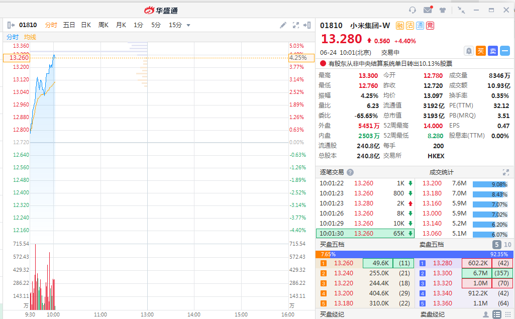 新浪港股讯 6月24日消息,小米集团涨幅扩大,现涨4.4%,报13.28港元。