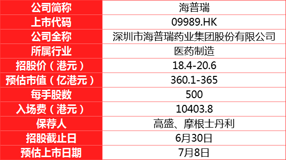 海普瑞于港交所发布公告,将于2020年6月24日至6月30日招股,拟发行2.2亿股H股,其中香港发售2201万股H股,国际发售1.98亿股H股。发售价为每股H股18.40港元至20.60港元。每手交易500股,入场费10403.8港元,预期于2020年7月8日上市交易。