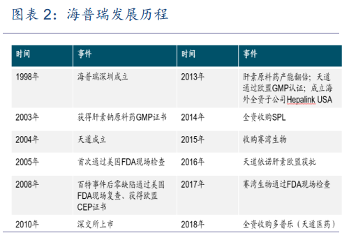 海普瑞以肝素原料药业务起家,2014年收购美国肝素原料药公司SPL,进一步完善和强化肝素原料药领域布局,2018年海外收购多普乐(天道母公司),向产业链下游肝素制剂延伸,打通肝素全产业链。