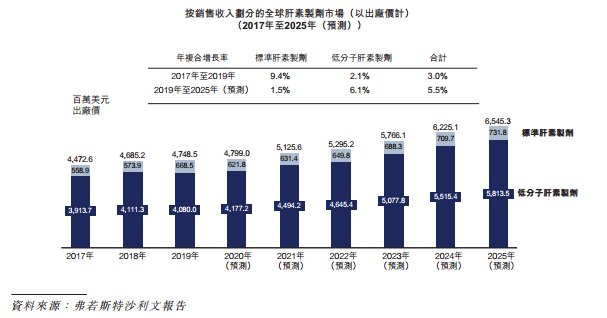 根据弗若斯特沙利文的资料,2019年依诺肝素的全球使用量达到7.82亿注射器╱瓶,预计到2025年将达到10.68亿注射器╱瓶。2019年依诺肝素在中国的使用量为5200万注射器╱瓶,预计将以23.6%的年复合增长率增至2025年的1.86亿注射器╱瓶。