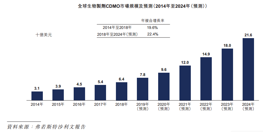 随着大量中小型生物制药公司的出现,全球生物CDMO市场规模2014年-2018年以22.4%的年复合增长率增长,预计在2024年将达到216 亿美元。